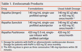 Evolocumab is also available in 140-mg single-use prefilled syringes and autoinjectors (Repatha Sureclick).1 Use of these formulations to administer the once-monthly dose (420 mg) requires patients to inject themselves three consecutive times within 30 minutes. Another PCSK9 inhibitor, alirocumab (Praluent), is injected every 2 weeks; it is available in single-dose prefilled syringes and pens.