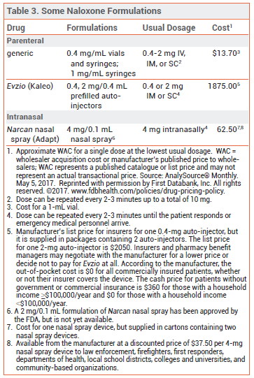 NALOXONE — Naloxone is the drug of choice for emergency treatment of opioid overdose. It is available in various dosage forms for intravenous (IV), intramuscular (IM), subcutaneous (SC), or intranasal administration (see Table 3).44,45