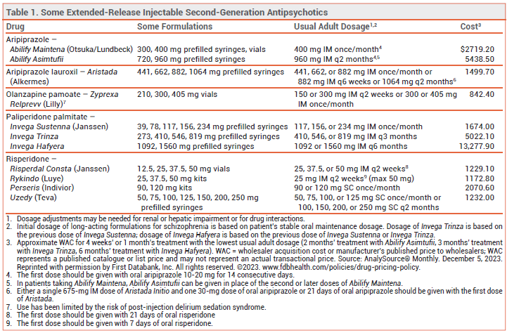 EXTENDED-RELEASE INJECTABLE ANTIPSYCHOTICS — Extended-release injectable second-generation antipsychotic drugs are generally used in patients with a history of relapse due to poor adherence to oral maintenance therapy. They are believed to improve adherence, hospitalization and relapse rates, and long-term outcomes in patients with schizophrenia, even though a benefit has not been consistently demonstrated in controlled trials comparing them with oral formulations.2-4